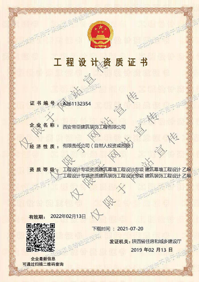 二級、環(huán)保工程專業(yè)承包 三級、建筑工程施工總承包 三級、機(jī)電工程施工總承包 三級、工程設(shè)計(jì)專項(xiàng)資質(zhì)建筑幕墻工程設(shè)計(jì)專項(xiàng) 建筑幕墻工程設(shè)計(jì) 乙級、工程設(shè)計(jì)專項(xiàng)資質(zhì)建筑裝飾工程設(shè)計(jì)專項(xiàng) 建筑裝飾工程設(shè)計(jì)